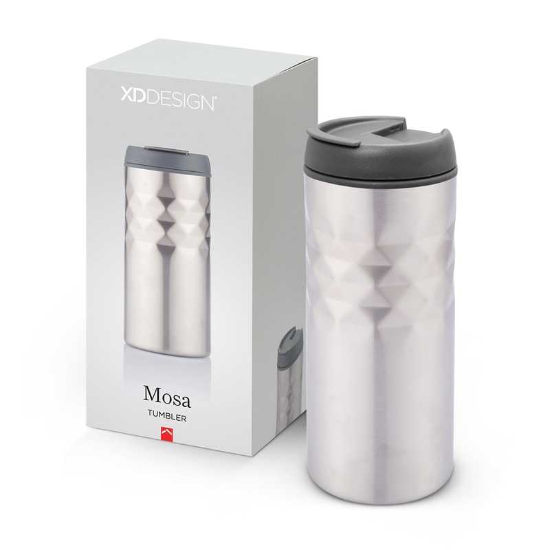 Smart 300ml double wall thermal tumbler with a decorative patterned stainless steel outer wall, a plastic inner wall and a secure screw on lid with a no leak flip closure which has a soft rubber seal. It laser engraves to a natural etch and is presented in a printed XD Design gift box.