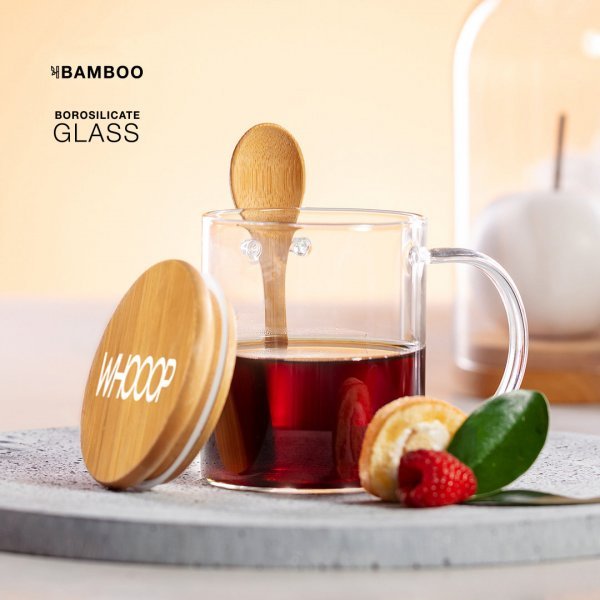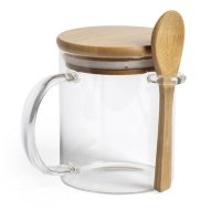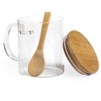 420 ml nature line mug. Made of borosilicate glass. Offering an exceptional resistance and durability. With lid and spoon in polished bamboo. Presented in an attractive eco design box. Colours: Natural. Dimensions: 10.6 x 8.7 cm.