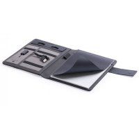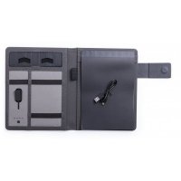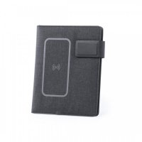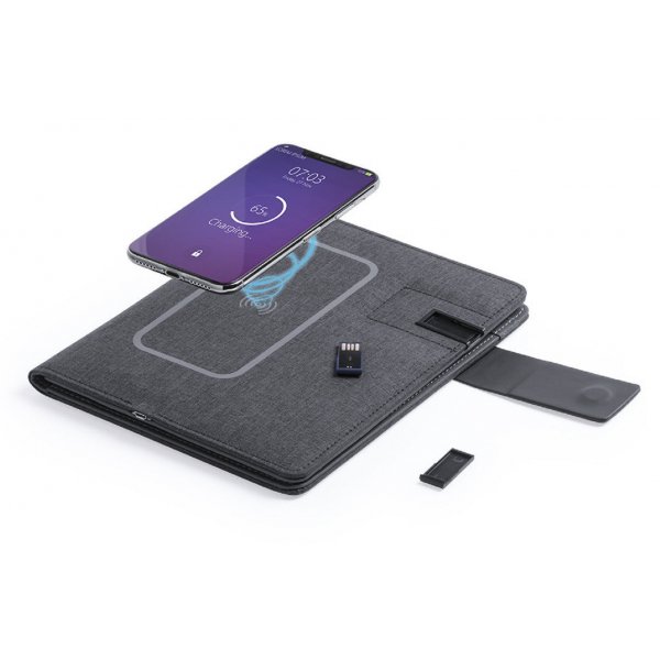 Wireless charging notebook, with 16GB USB flash memory -integrated in cover- and great charging capacity battery 4,000 mAh. In soft 300D polyester in graphite finish, with magnet closure and metal plate for logo. Plenty of storage compartments to store business cards. USB flash memories. Holder for smartphones/tablets and LED charge indicators inside. Including a 20-page A5-size notepad. The easy access to the charging station via micro USB cable - included-, Makes this folder the perfect gadget for business and studying. Compatible with devices equipped with wireless charging technology. Colours: Black. Dimensions: 17.5 x 22.2 x 3 cm.