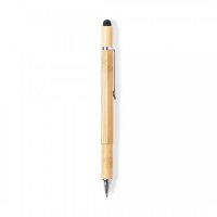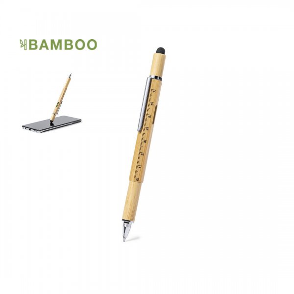 Nature line multifunction ball pen made of bamboo. Twist mechanism and blue ink, with metal clip and chromed accessories. Functions: ball pen, stylus, flat and philips screwdriver, level, and ruler (1 accessory, 6 functions). Colours: Natural/Silver. Dimensions: 15.1 x 1.2cm, 21 grams.