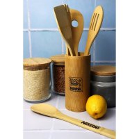 An essential to have in all kitchens, comes the Harris Kitchen Utensils Set. The set comes with 5 different cooking bamboo utensils neatly stored in a bamboo canister for your convenience. Made from bamboo, they are strong, durable and easy to keep clean after use and ideal for using with non-stick pans as they will not scratch the surface of your cookware. This set includes: a solid spoon, a turner spatula, a three-hole spoon, a rounded fork, a single-hole spatula and a storage canister. Bamboo is commonly referred to as a "wonder" material, and its characteristics make it difficult for liquids to absorb, making cleaning a breeze. Simply hand wash with soapy water and you're good to go. Colours: Natural. Dimensions: L 330mm x W 90mm D 90mm.