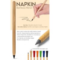 The innovative Inkless Napkin Bamboo Pencil, made from alloy metal with a bamboo barrel that ensures a smooth writing experience without the need for sharpening. The black writing is not only vibrant but also erasable for ultimate convenience. The coloured flat end paper cap adds a stylish touch while preventing the pencil from rolling on your table. Elevate your writing with this eco-friendly, durable, and effortlessly functional tool that combines modern design with practicality. Say goodbye to constant sharpening and hello to a refined writing experience. Colours: Black, Natural, Blue, Green, Orange, Red. Dimensions: 152mmW x 16mmH x 11mmD. Pencil: 138mmW x 10mmH.