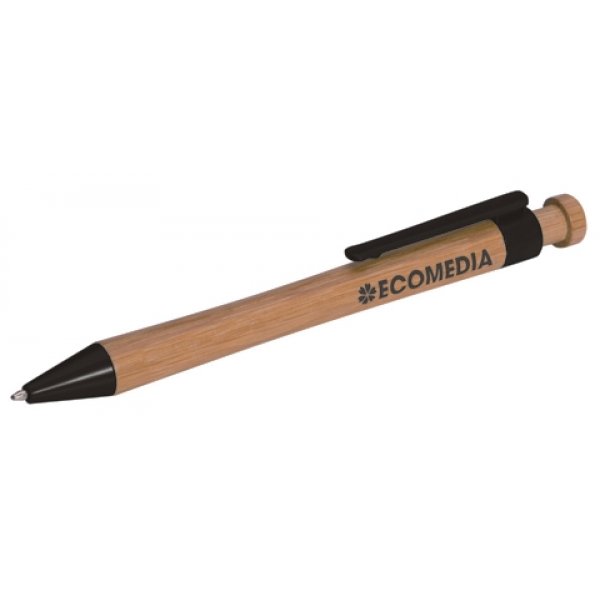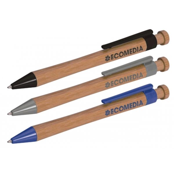 This quality bamboo pen is both practical and kind to the environment. Featuring biodegradable cornstarch fittings. Product packaging: bulk packed. Colours: black, blue, silver trim.