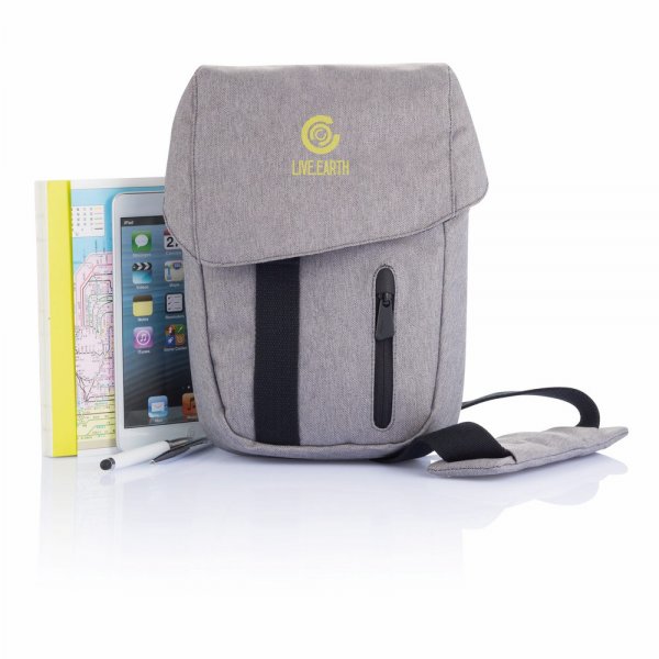 Trendy tablet bag made from RPET material|padded interior|zippered outside pocket|padded shoulder strap and large buckle closure. Registered Design. Colours: Grey. Dimensions: 290mm H x 240mm W.