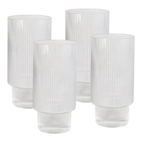 Lend an air of vintage sophistication to your next dinner party with the Oscar Ribbed Highball Glasses. Made from fluted glass these highball glasses, are sure to elevate your table and be the envy of all your dinner guests. As these glasses are hand blown, please allow for minor imperfections and differences between glasses. The Oscar Ribbed Highball Glasses come in a set of 4 and are a perfect option for corporate gifting and hampers. Colours: Clear. Dimension: