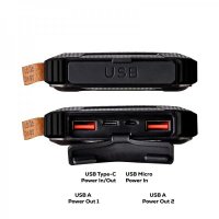 The 10,000 mAh Outback Pro is a fast-charging 22.5W power bank in a rugged, splash-proof solar charge case. Manufactured from recycled ABS and providing an A-grade lithium-polymer battery, the Outback Pro features Type-C and Micro USB inputs with a Type-C (PD20W) and dual USB outputs for charging 2 devices simultaneously. The upgraded Outback Pro protects and stabilises the output voltage, preventing overcharging or short circuits. It also includes a magnetic compass, dual LED torch, and capacity indicator. This power bank is suitable for charging smartphones, tablets, and any 5 Volt device requiring a charging cable. It is ideal for outdoor activities and overnight hikes. Includes a Type-C charge cable and a user manual. Packaged in recycled raw box (170 x 90 x 24 mm). Also available a customised marketing printed sleeve. Colours: Black. Dimensions: 163 x 85 x 22 mm.