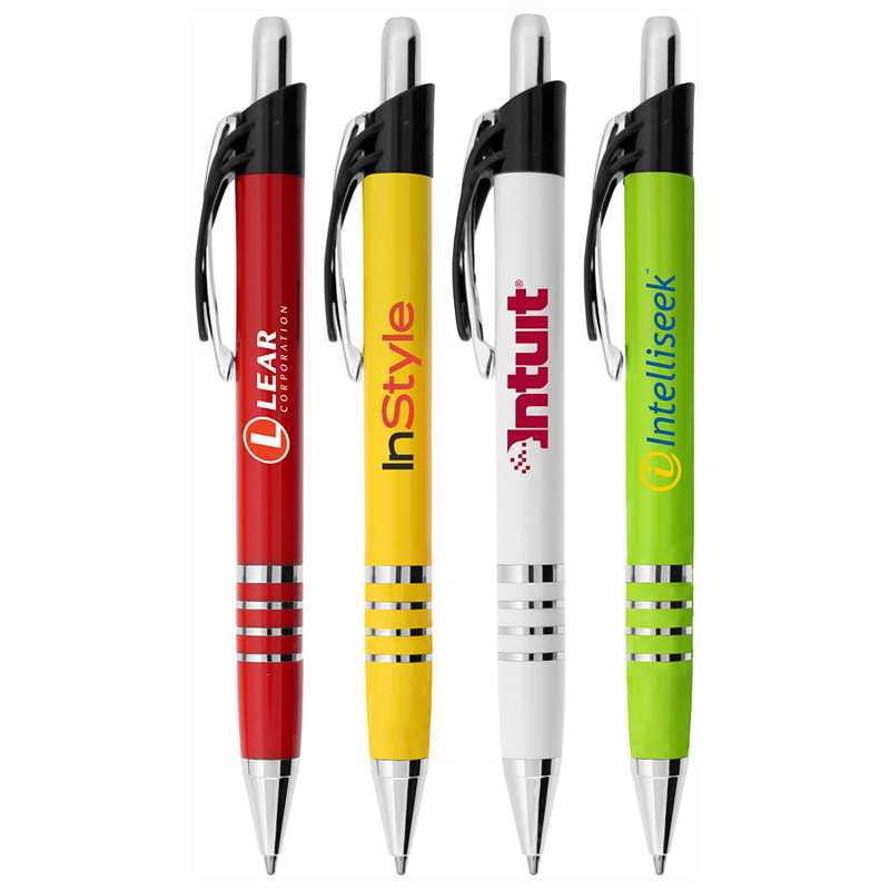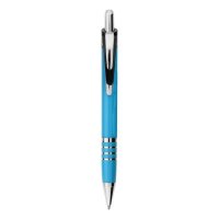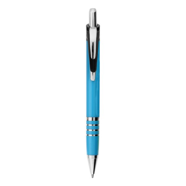A click action ballpoint pen made with shiny metal accents, a pocket clip and black ink. Colour/s: Red, Cyan, Lime, Yellow or White Dimension: 140mm long.
