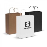 Large paper carry bag with strong paper rope handles. It is manufactured from 180gsm kraft paper. Colours: Black, Natural, White. Dimensions: H 330mm x W 254mm x Gusset 127mm (excludes handles). Handle Length: 260mm.
