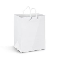 Large paper carry bag with strong woven polypropylene rope handles. It is manufactured from gloss laminated 157gsm art paper and can be branded with stunning edge-to-edge spot colour or full colour printing on all sides including the base. A production lead time of 35 working days applies to this product by air freight and larger orders can be sea freighted on request to reduce the freight cost. Colours: Custom. Dimensions: H 328mm x W 254mm x Gusset 126mm (excludes handles). Handle Length: 270mm.