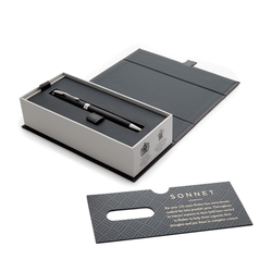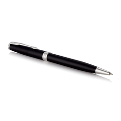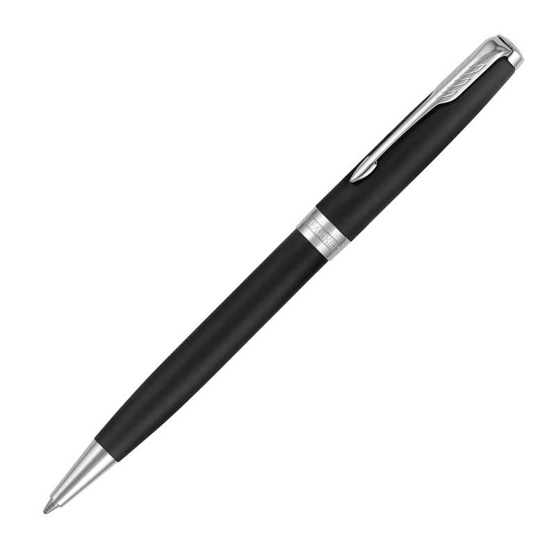 Stunning in matt black finish with elegant chrome trim, the Parker Sonnet Ballpoint Pen offers an elegant twist action, retractable blue ballpoint. Parker pens can be printed or engraved (Champagne finish) on cap or upper barrel providing great options for your promotional logo. Colour: Matte Black CT.