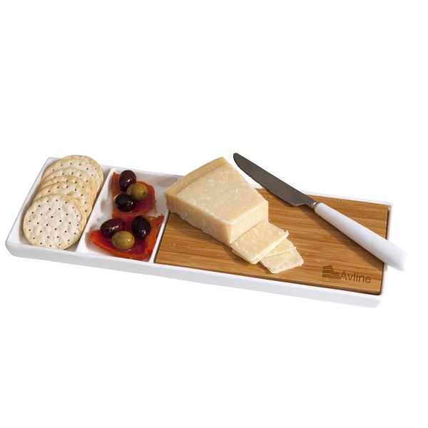 Party Plattere combines stylish ceramic with environmentally friendly bamboo. Used around the office and at home this is the ideal product to feature your logo. Because of the unique nature of bamboo, the product and engraving colour may vary from item to item. Colours: Natural Bamboo, White Ceramic. Dimensions: 10.5cm x 33cm wide. Product packaging: white biodegradable box.