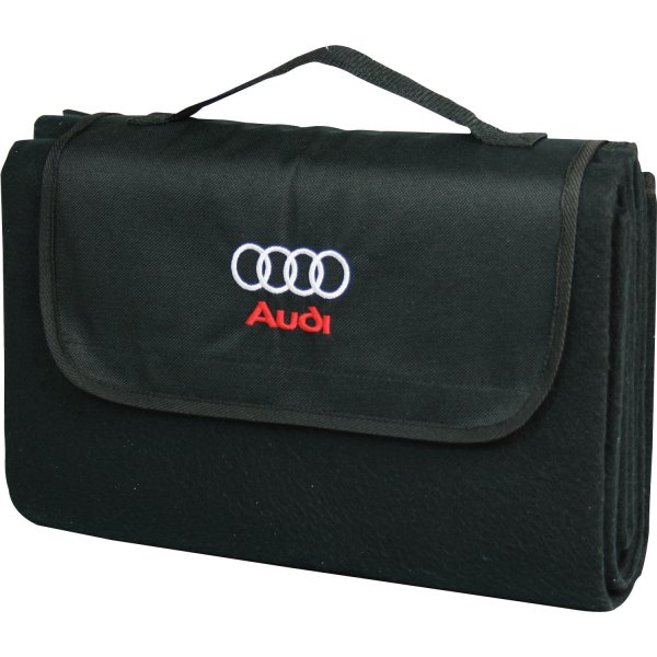 Monochrome fleece picnic rug with waterproof PEVA backing and Nylon front flap for branding with velcro closure. Colours: Black. Dimensions: Open 130 x 170cm.