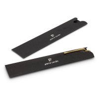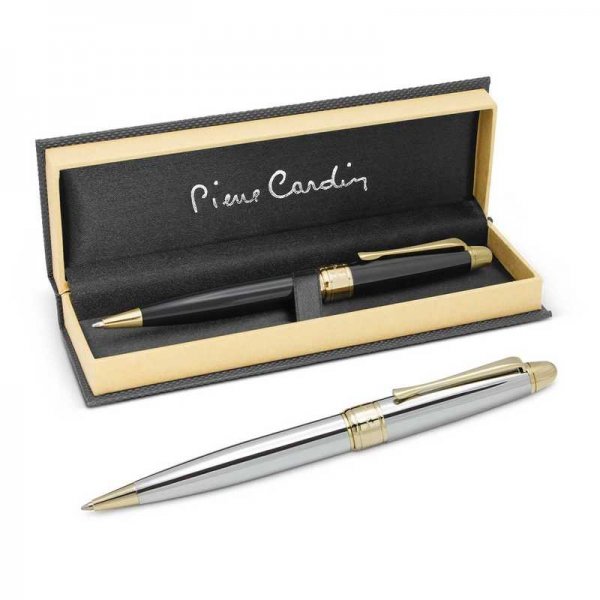 Montfort is a true French classic masterpiece with an intoxicating design that is dominated by flowing curves. It has a precise twist action with a brass barrel which is finished in the choice of lacquered black which laser engraves to a brass finish or shiny chrome which laser engraves to a natural etch. The black large volume refill has 4000 metres of German manufactured Dokumental ink and a tungsten carbide ball for improved writing quality. Montfort has the Pierre Cardin logo tastefully engraved on the centre ring and can be presented in an optional Pierre Cardin sleeve or Pierre Cardin gift box. Colours: Silver/Gold, Black/Gold. Dimensions: Dia 11mm x L 140mm x 15mm (includes clip).