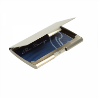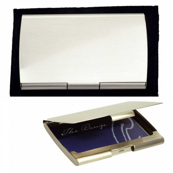 Metal/silver nickel executive style pocket business card holder. It holds approximately 17 business cards. Custom engraved silver (tone on tone). Wrapped in tissue paper in a black velvet pouch in a polybag sitting in a black moulded insert and presented in a plain black 2 part gift box. Colours: Silver. Dimensions: 101mm(w) x 63mm(h).