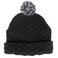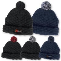adult beanies: woven pattern acrylic knit with cuff and pom pom