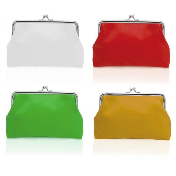 Coin purse in cheerful design with soft body in PVC of bright colours variety. Main compartment with metal buckle closure. Colours: Green, Red, White, Yellow. Dimensions: 17 x 11 x 2 cm.