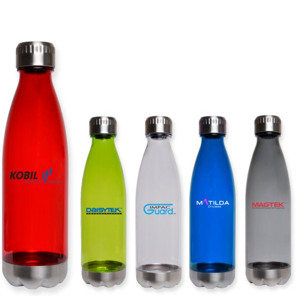 A 700ml AS plastic water bottle with stainless steel cap and base. Perfect and stylish for carrying cold drinks on the go. All Bottles are 100% BPA Free, hand wash only, and not for use in freezer. Colours: Translucent Lime, Red, Blue, Smoke, Clear, Cyan, Purple. Dimensions: 235mm H x 85mm W.