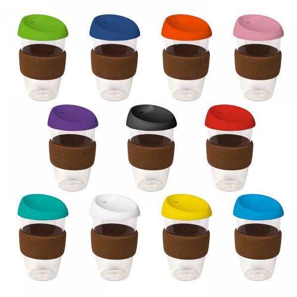 Clear Plastic Karma Kup with Cork Band, Silicon Lid, light, durable. Do not microwave or use in microwave oven. It is not safe for use in dishwasher.