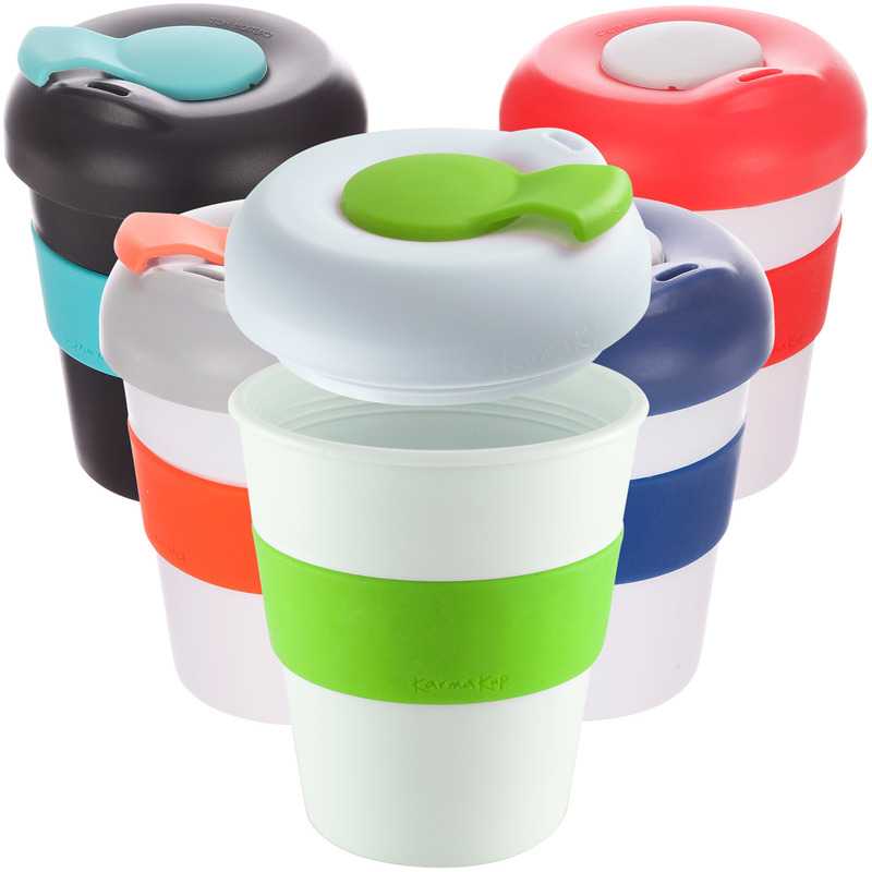 Put an end to waste and put sustainability in the palm of your hand with reusable, recyclable, eco Karma Coffee Kups. Customise your Karma Kup Profile with brilliantly coloured lids, stoppers and bands, then add your logo to make it truly yours. Mix and Match welcome. Do not microwave or use in microwave oven; top rack dishwasher safe, but hand wash recommended so the print last. Size: 105 x 90mm.