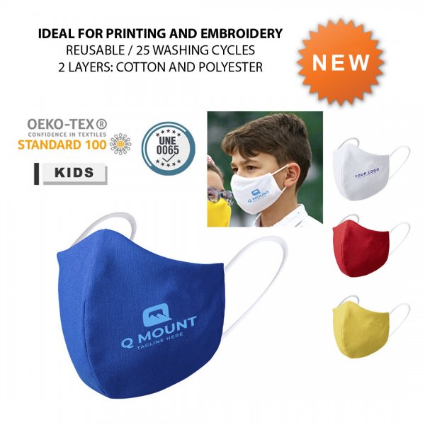 Reusable hygienic mask for children. Made of cotton and polyester double layer, with ergonomic front stitching for a comfortable fit and elastic ear bands in hypoallergenic fabric, with OEKO-TEX Class I certification. For personal use. Medium size (6 to 9 years old). The fitting, use and removal of the mask must be supervised by an adult. Certified by EU Notified Body and manufactured according to UNE 0065 specification. Bacterial filtration efficiency: > 98%. Highly resistant, up to 25 washings. A minimum washing temperature of 60°C is recommended. Colours: Blue, Red, White, Yellow. Dimensions: 22 x 10.5 cm.