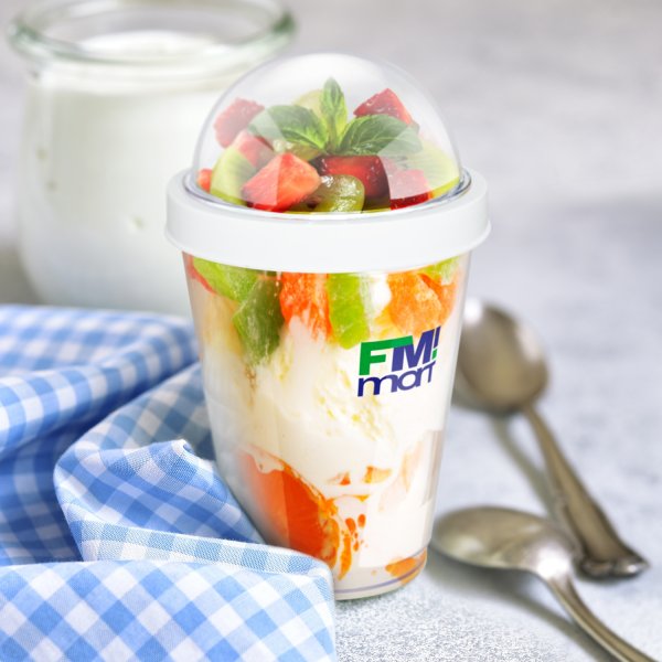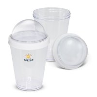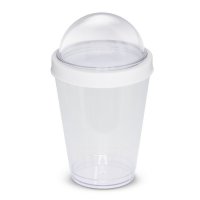 Breakfast or lunch on the go is easy with the 300ml Yogo Cup. This convenient reusable yoghurt cup has a separate domed compartment to store fruit, muesli and dry ingredients. The cup and domed compartment are manufactured from clear AS material which is BPA-free and it has a secure screw on polypropylene lid. This product is not dishwasher safe and handwashing is recommended. Colours: White/Clear. Dimensions: Dia 81mm x 160mm.