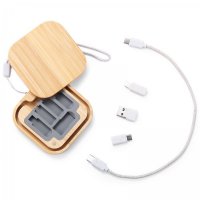 Introducing the Reveal Square Adapter Set – a sleek and eco-conscious storage solution for your essential charging adapters. Designed with natural bamboo and wheat straw elements, this compact adapter set features a magnetic sliding lid for effortless access. A grey braided carry strap adds portability for on-the-go convenience. Inside, you'll find a Type C to Type C adapter, along with Type A, Micro USB, and iOS adapters, ensuring wide device compatibility. Supporting fast charging, these adapters are crafted from sustainable wheat straw, reinforcing their eco-conscious appeal. A grey insert in the base keeps everything securely in place.Stylish, functional, and environmentally responsible, the Reveal Square Adapter Set is the perfect companion for tech users. Colour: Natural/White. Dimensions: 77 x 77 x 16mm (LxWxH).