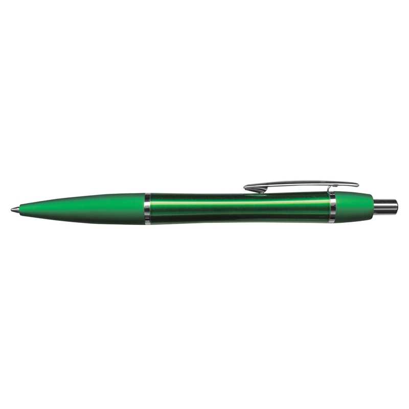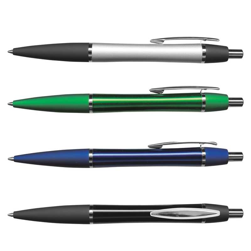 Retractable aluminium ball pen with a lacquered barrel, a soft touch rubber lacquered grip and shiny chrome accents. It has a black large volume refill with 1200 metres of writing ink and blue is available for an additional charge. Rio laser engraves to an oxidised white colour and can be presented in an optional velvet sleeve or a gift box.