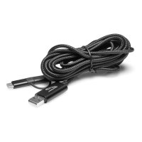 Massive 3 metre cable lets you charge at a distance. No longer will you have to cuddle up with your nearest power point. In addition to the amazing length, you have a 3 in 1 charging unit equipped with a micro USB, lightning connector and USB C adaptor. Includes plastic storage tube for easy storing when not in use. Colours: Black, Blue. Dimensions: 140mm H x 40mm diameter.