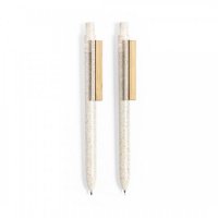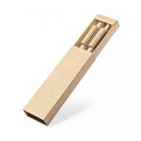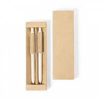 Nature line, set of ball pen and mechanical pencil. Made in a combination of wheat straw and bamboo clip, to promote the use of natural raw materials and reduce pollutant emissions. Clip with a wide branding area. Blue ink ball pen and mechanical pencil with 2 x 0.5mm leads included. Presented in an individual, recycled cardboard box, with Wheat Straw logo on the top of the pen and mechanical pencil. Colours: Natural. Dimensions: 14 x 1cm - pen size, 40 grams.