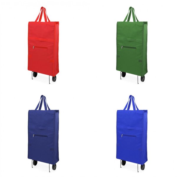 Folding shopping trolley in resistant 600D polyester, in varied range in bright tones. With matching colour reinforced nylon handles, matching colour front zipper pocket and metal stand. Small folding size. Colours: Blue, Green, Navy, Red. Dimensions: 32 x 54 x 13.5 cm.