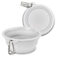 Handy collapsible silicone pet bowl featuring a carabiner available in 5 different colours. This bowl is portable and easy to store, you can ensure your pet stays hydrated anytime and anywhere. A production lead time of 25 working days applies to this product. Colours: Black, Blue, Green, Red, White. Dimensions: Folded: Dia 130mm x H 12mm. Open: Dia 130mm x H 52mm.