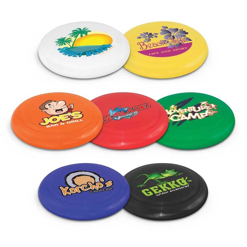 Small recreational flying disc with a very prominent branding area. Colours: White, Yellow, Orange, Red, Green, Blue, Black. Dimensions: Dia 145mm x 19mm.