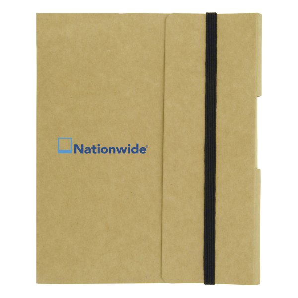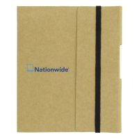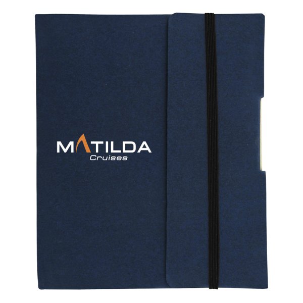 A smaller version of our T-935 Large Tuck Journal. The Small Tuck Journal notebook comes with a heavy flexible paper cover made from recycled paper and has 85 pages of recycled lined paper. Other features include a blank black ink pen made from recycled paper and an elastic band to keep the notebook closed. The inside cover and each page have the recycled logo in the corner. Item cover is made from 100% recycled material. Colour/s: Blue or Tan Dimension: 120mm w x 146mm h.
