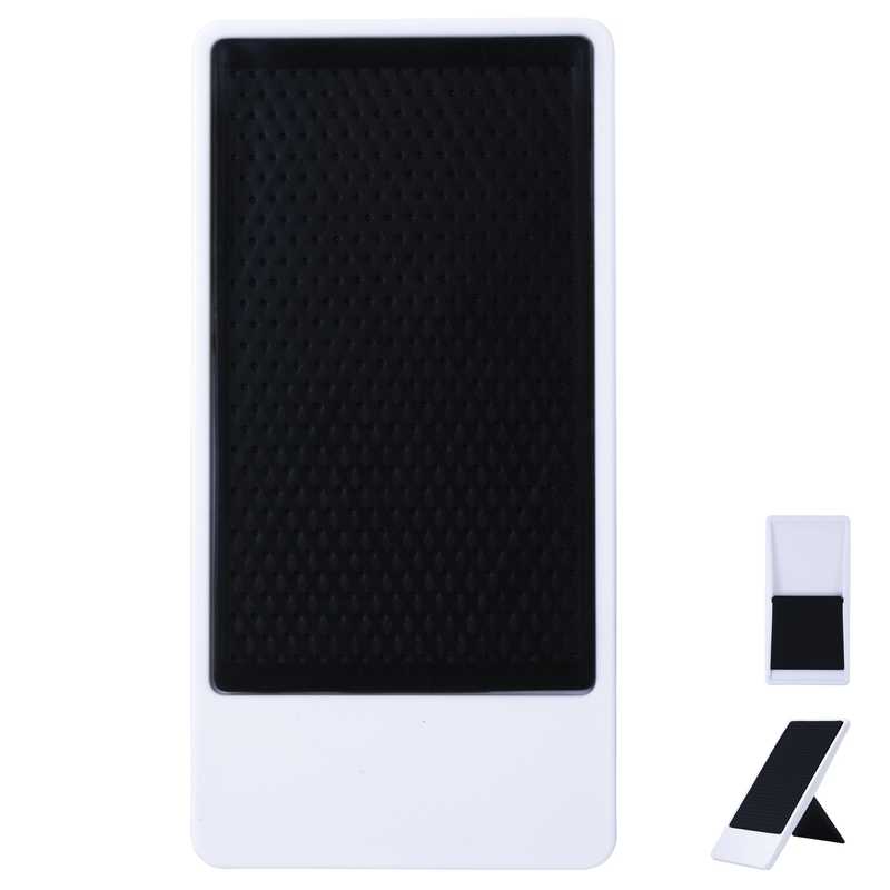 White folding phone holder with coloured silicone grip pad. Keeps your mobile in an upright easily viewable position.