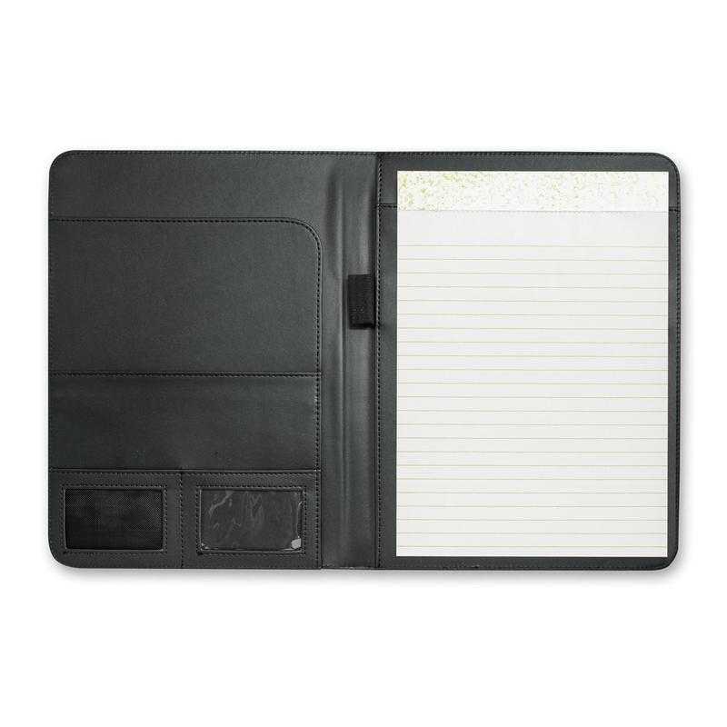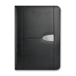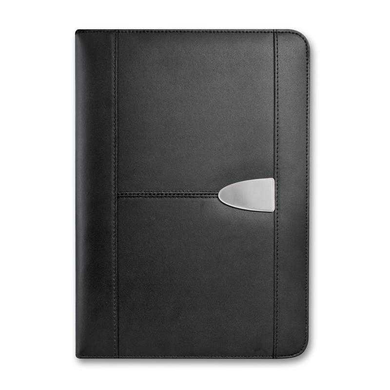 Superior large portfolio with a superb bonded leather cover. It has a lined A4 pad, a business card pocket and a pen loop. Sovrano has a unique metal centre plate which can be branded with the choice of a resin coated finish or a metal insert that laser engraves to a stainless steel finish. It can also be laser engraved directly onto the portfolio and can include individual names for an additional charge. The portfolio surface laser engraves to a matt brown finish. Colours: Black. Dimensions: W 240mm x L 332mm x 19mm.