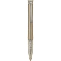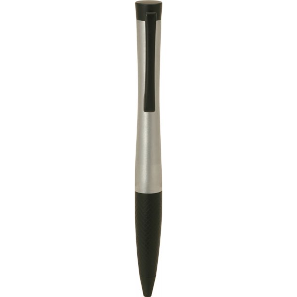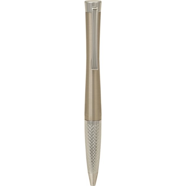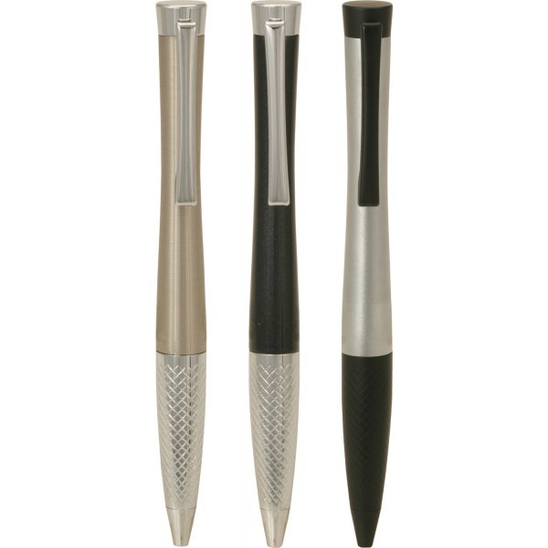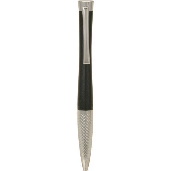 A contemporary style metal pen with coloured barrel, silver clip and contrasting silver textured grip. Parker style black refill. Colours: black, nickel, silver.