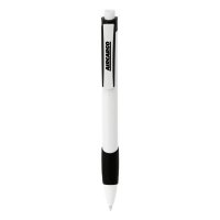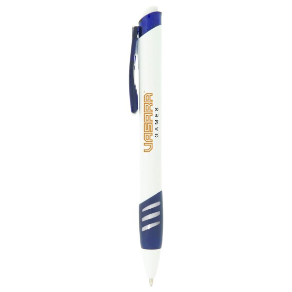 A click action ballpoint pen with a white barrel, supplied with standard black ink refill. Colour/s: White with Red, Blue, Purple Translucent Trim or White with Solid Black Trim Dimension: 146mm long.