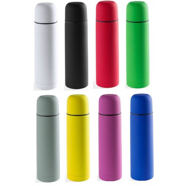500ml stainless steel thermos flask in bright colours. With safety dispenser and screw-on cap. Presented in an individual biodegradable box. Colours: Black, Blue, Fuchsia, Green, Grey, Red, White, Yellow. Dimensions: 24.5 x 7 cm.