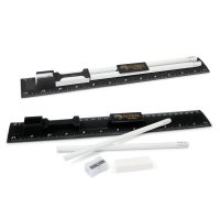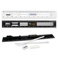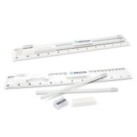 Unique stationery set which consists of a 30cm ruler, two unsharpened pencils, a pencil sharpener and an eraser in one compact unit. The ruler has both metric and imperial graduations. Colours: Black, White. Dimensions: W 40mm x L 315mm x 19mm.