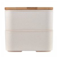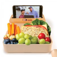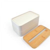 - 2-tier lunch box with bamboo lid that functions as a phone holder