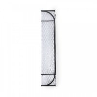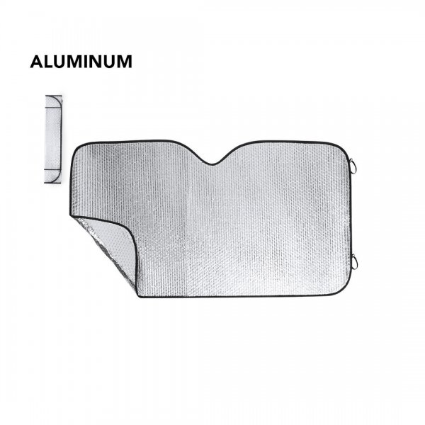 Aluminium sunshade with bubble on both sides, metallic silver finish with black piping. With elastic bands for folding to put away and easy unfold for opening, with separate bags. Colours: Silver. Dimensions: 130 x 70cm, 160 grams.