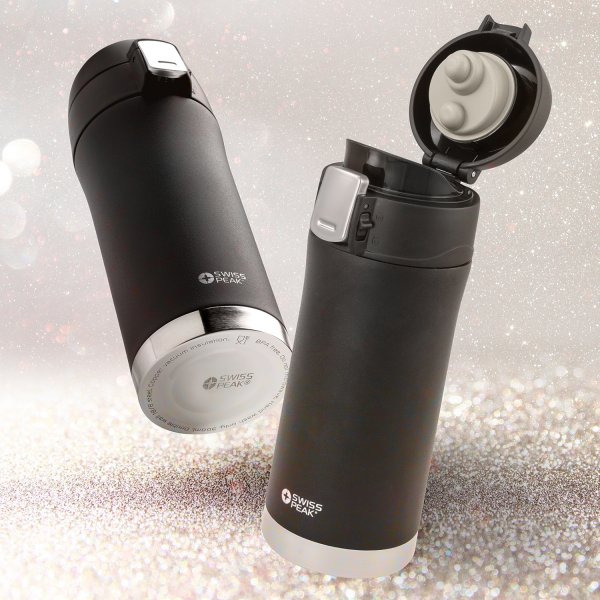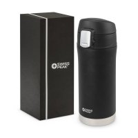 Premium 300ml double wall, vacuum insulated stainless steel coffee mug. It has a unique copper lining on the inner wall which improves its performance and the outer wall has a tough powder coated finish. Elite will keep drinks hot for up to 12 hours and cold for up to 24 hours. It features a secure screw on lid with a push button activated flip closure which is spring loaded for smooth, effortless operation. The locking mechanism on the lid prevents leaks and spills even if the cup is knocked over. This precision coffee mug is BPA-free and laser engraves to stainless steel finish. It is presented in a Swiss Peak gift box with an information leaflet included. This product is not dishwasher safe and handwashing is recommended. Colours: Black. Dimensions: Vacuum Mug: Dia 62mm x 190mm. Gift Box: W 78mm x H 200mm x 78mm.