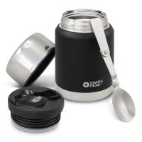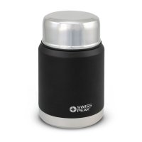 Premium 500ml double wall, vacuum insulated stainless steel food flask. It has a unique copper lining on the inner wall which improves its performance and the outer wall has a tough powder coated finish. Elite will keep food hot for up to 12 hours and cold for up to 24 hours. It has a screw on serving bowl and a foldable stainless steel spoon which snaps securely into the lid. This precision vacuum flask is BPA-free and laser engraves to a shiny steel finish. It is presented in a Swiss Peak gift box with an information leaflet included. This product is not dishwasher safe and handwashing is recommended. Colours: Black.