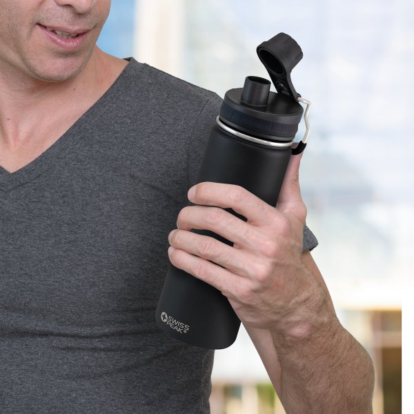 Premium 700ml Swiss Peak vacuum insulated drink bottle that embraces excellence. The stainless steel, double wall construction will keep drinks cold for 24 hours or hot for up to 12 hours. The secure screw on lid has a silicone ring for easy opening, a flip closure and a metal carry handle that features a soft-touch silicone grip. This understated bottle is BPA-free and has a tough powder coating which laser engraves to shiny steel finish. It is beautifully presented in a Swiss Peak gift box with an information leaflet included. This product is not dishwasher safe and handwashing is recommended. Colours: Black. Dimensions: Bottle: Dia 78mm x H 273mm x 83mm (includes handle). Gift Box: H 288mm x w 84mm x 84mm.