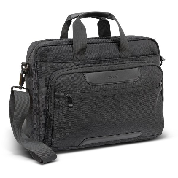 Make the daily commute easier and more stylish with the Swiss Peak Voyager Laptop Bag. It is manufactured from premium 1680D polyester fabric with smart PU accents and 210D polyester lining. The large main compartment has a zippered closure and features a padded pocket that will comfortably hold a 15-inch laptop. It has another zippered compartment with two internal slip pockets that offer RFID protection, a pen holder and an external zippered side pocket. The bag has woven carry handles with comfortable PU hand grips, an adjustable and removable shoulder strap with a soft shoulder pad and a rear luggage sleeve that slides over the handle of a rolling suitcase. The Swiss Peak logo is subtly branded on the laptop pocket and is debossed on the front pocket. Colours: Black. Size: W 420mm x L 310mm x 65mm Gusset. Handle Length: 380mm. Strap Length (extended): 1500mm.