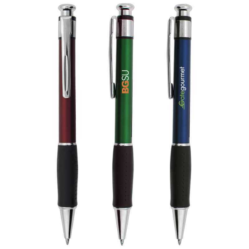 A click action ballpoint pen with black ink, a soft grip and a metal pocket clip.