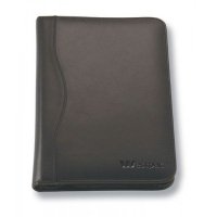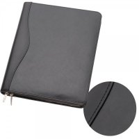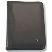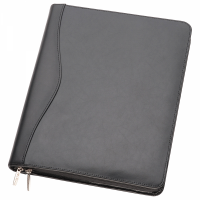 Features include zippered closure, inside gusseted pockets, zippered gusseted internal pockets, business card holders, pen loop and A4 white-lined pad which inserts from the top. Made from top grade cowhide leather and zippered closure. Pen not included. Presented in a plain blue 2-part gift box with a plastic cover. Colours: Black. Dimensions: 270mm(w) x 345mm(h). Packaging Size: 300mm(h) x 366mm(w) x 35mm(d).