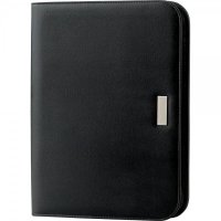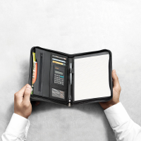 Stylish A4 compendium with solar calculator. Zippered closure. Includes refillable 30 page writing notepad. Front open document pocket. Internal expanding pocket, zippered pocket and pen loop. Pen not included. Colours: Black. Dimensions: 248mm(w) x 341mm(h) x 23mm(d).