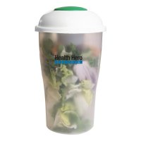 This shaker holds salad and dressing in separate compartments. The dressing container snaps into lid. A plastic fork clips on the side of the shaker. Capacity Approximately 710ml (24oz). Colours: White/Green trim. Dimensions: 196mm h.
