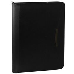 Manufactured from bonded leather with solar calculator. Features include zippered closure, inside gusseted pockets, zippered gusseted internal pocket, business card holders, pen loop and A4 white lined pad which inserts from the top. Will accommodate a side entry pad. Pen not included. Presented in a 2 part black deluxe gift box. Colours: Black. Dimensions: 280mm(w) x 341mm(h) x 52mm(d). Packaging Size: 360mm(h) x 300mm(w) x 50mm(d).